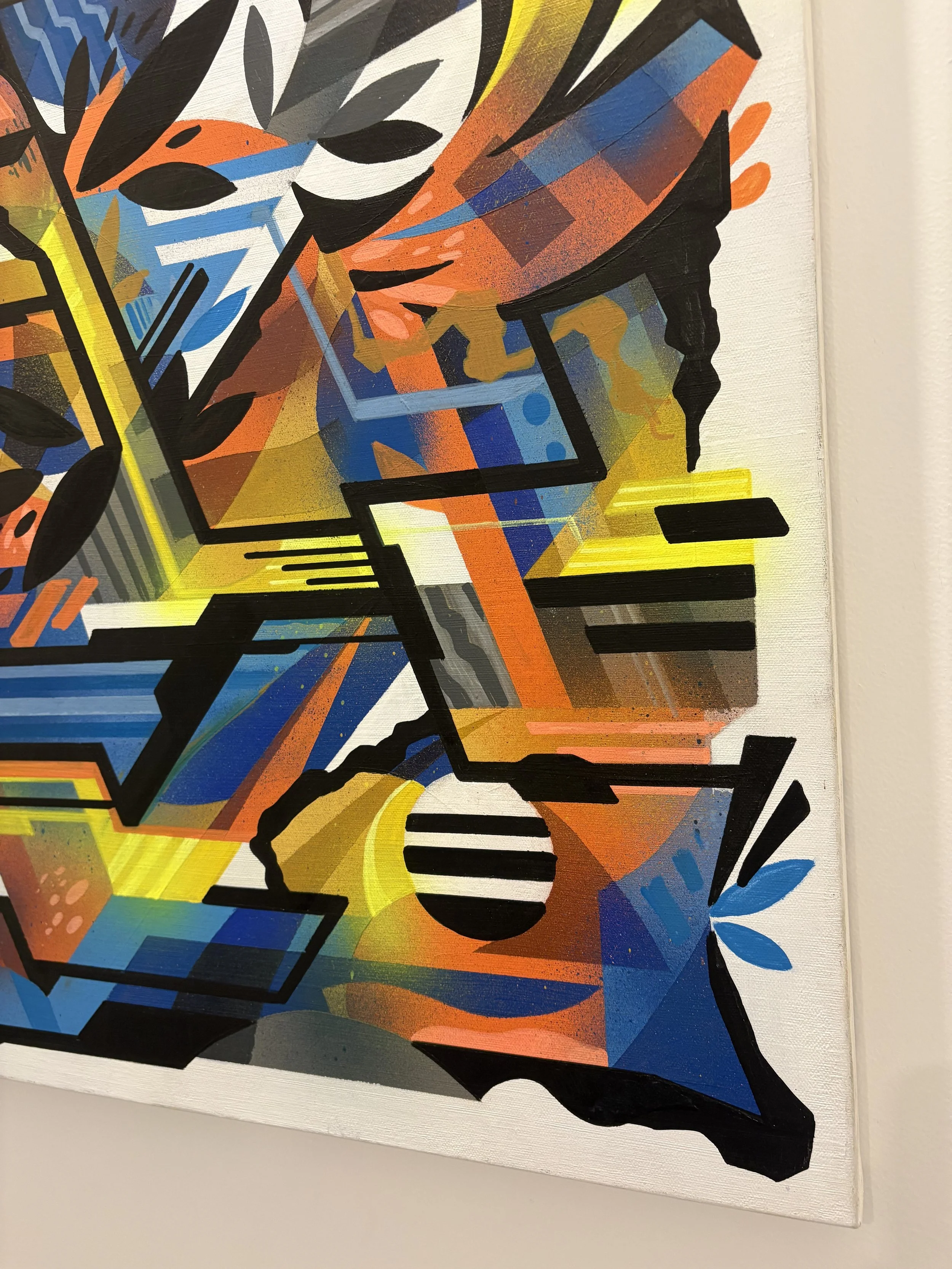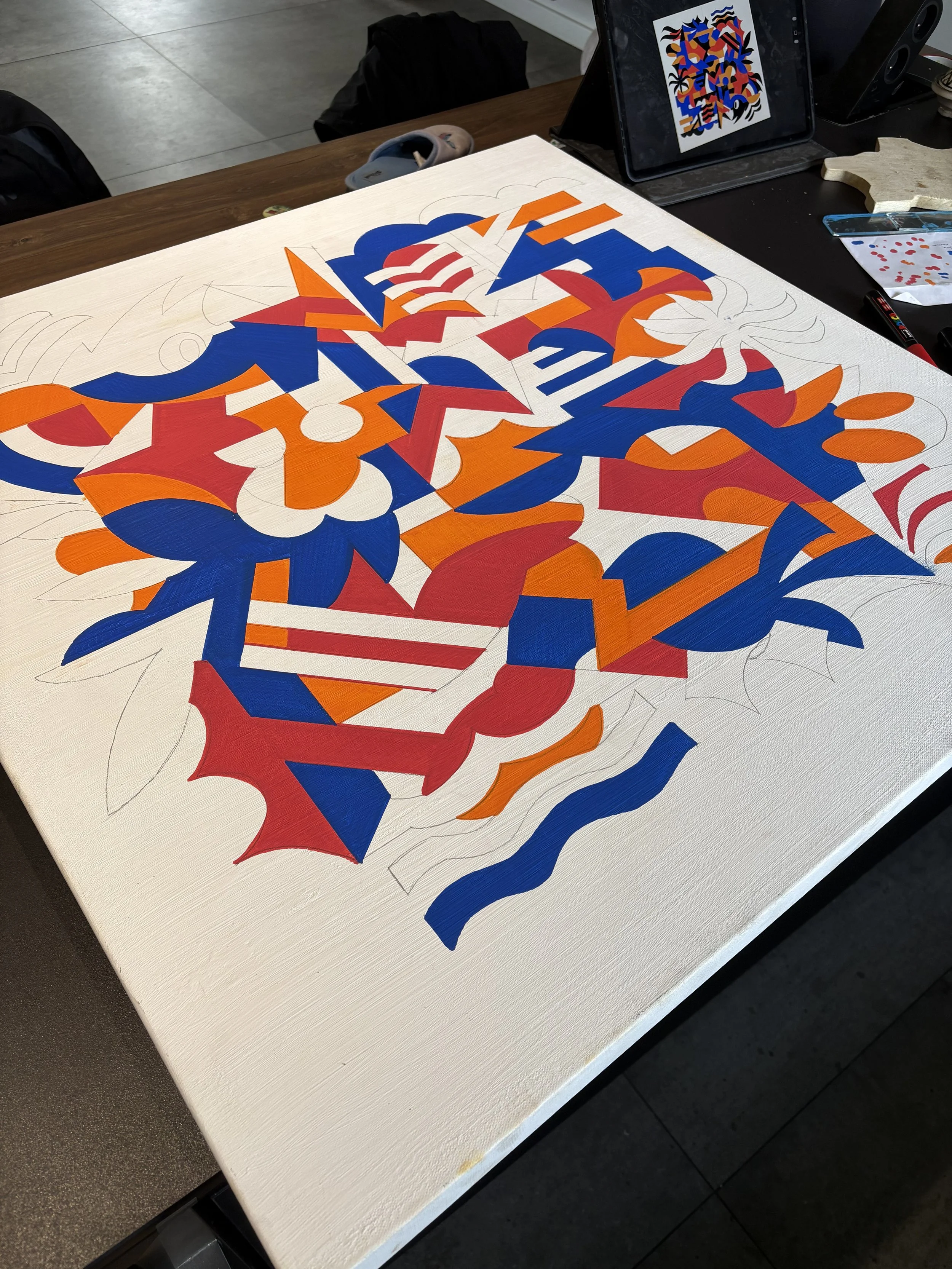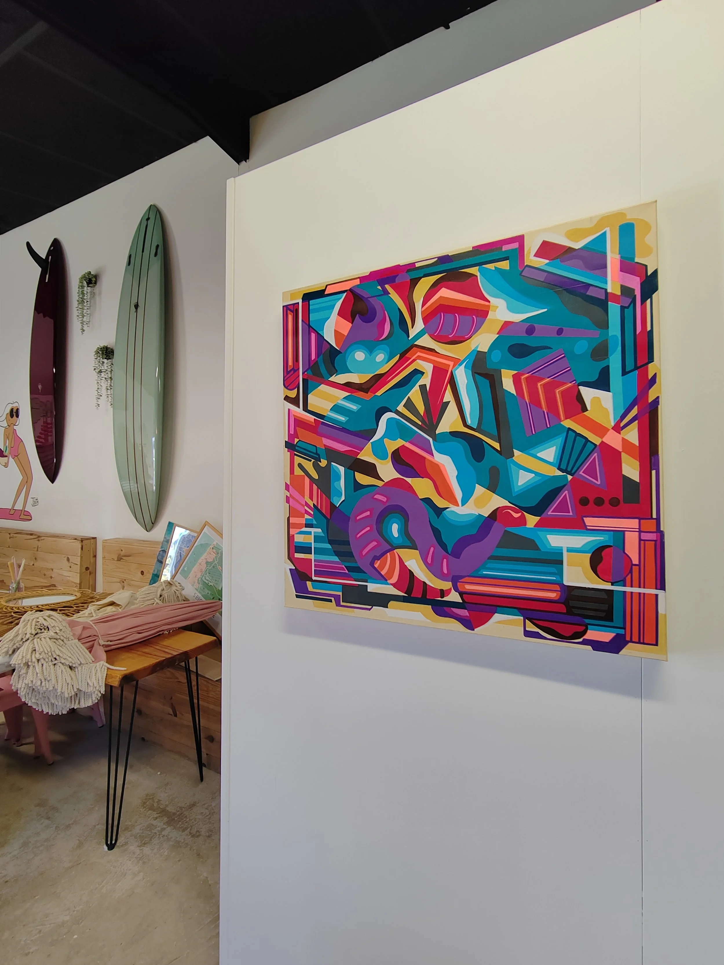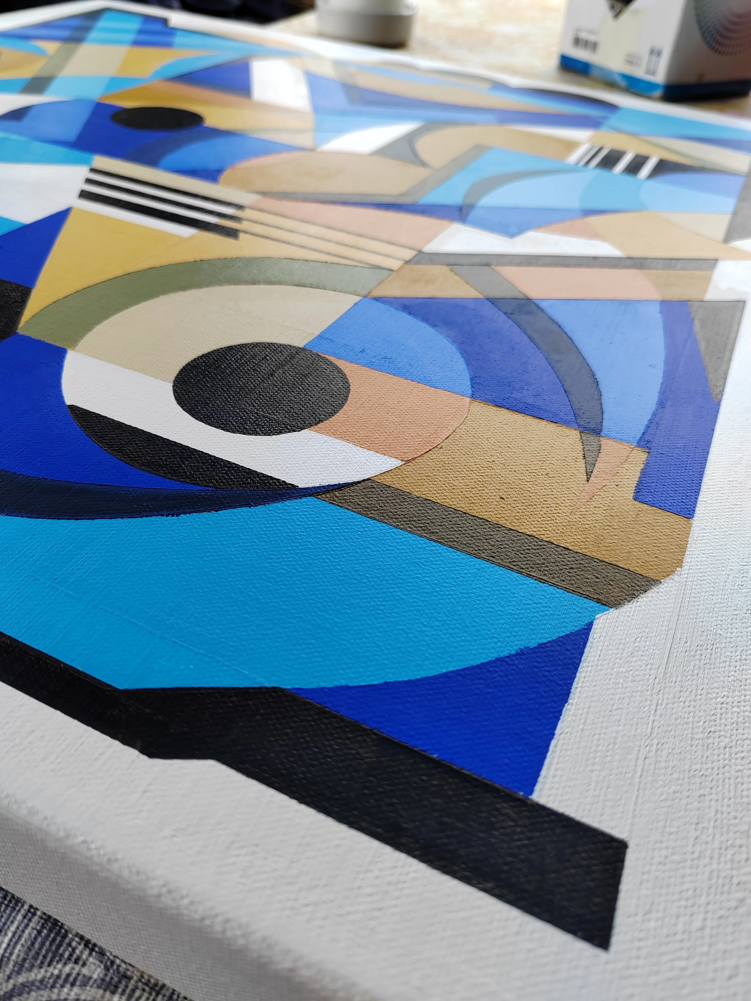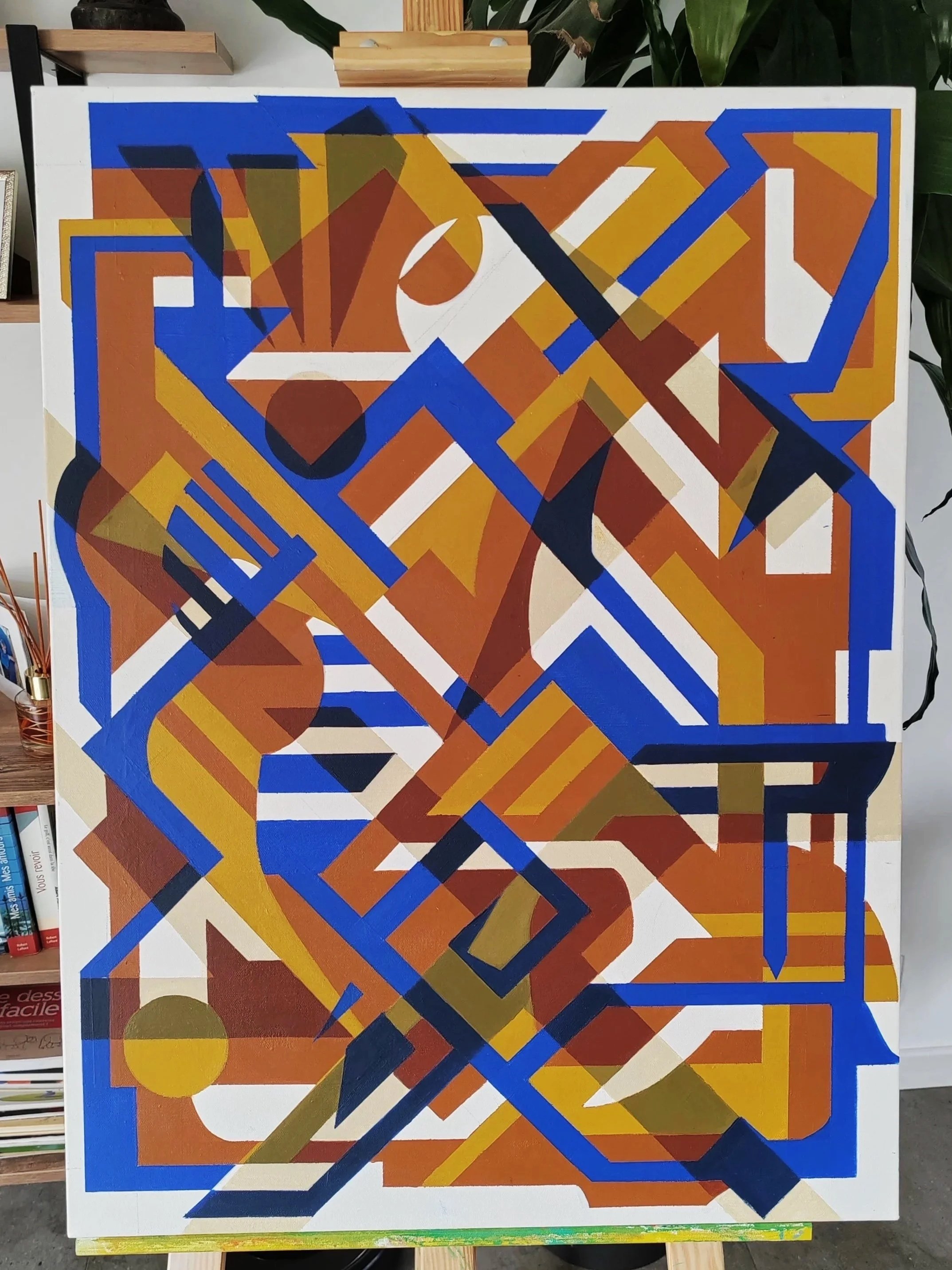 J’y explore l’équilibre entre abstraction et structure, en laissant la couleur et la composition devenir le terrain d’un dialogue plus intérieur.